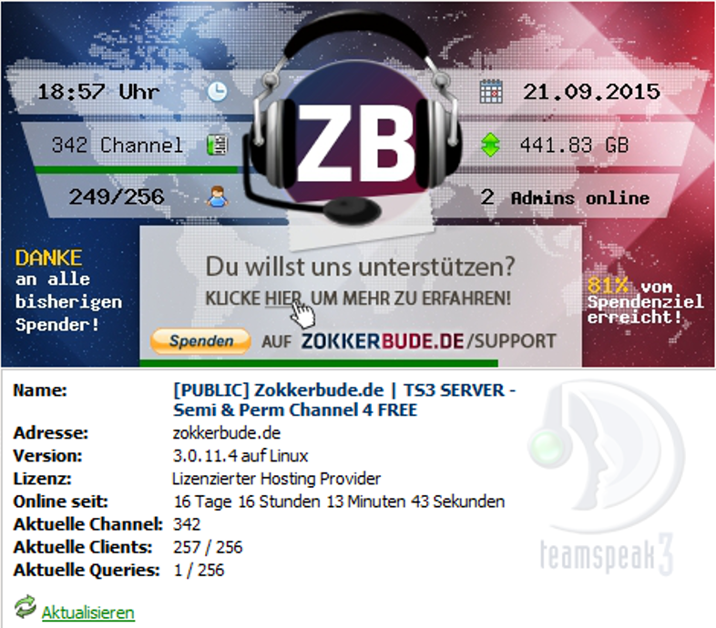 Für die Lizenzjahre 2020-2021 und der Corona-Pandemie hat uns TeamSpeak großzügigerweise das doppelte an Slots zugesichert für den Preis einer 256 Slot-Lizenz.