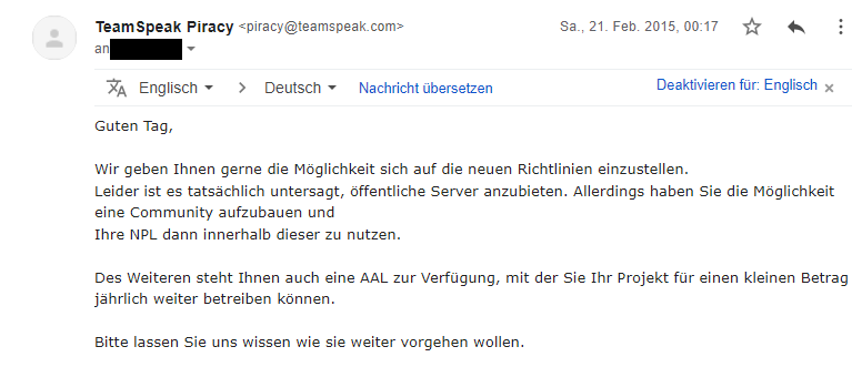 Der Plan war also klar: Zur Weiterführung des Projektes mussten wir zusätzlich auch eine jährliche Lizenz bei TeamSpeak erwerben. Die Lizenz, die mindestens notwendig war, war die sogenannte AAL (Annual Activation License) - heute heißt sie TS3 Gamer License.